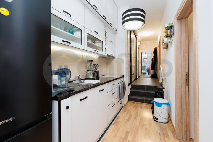 Ukupna površina stana iznosi 90 m² (pravno uknjižen na 72 m²), a posebnu pogodnost predstavlja njegova trenutna podela na dve funkcionalne stambene jedinice, koje se lako mogu spojiti u prvobitnu celinu.